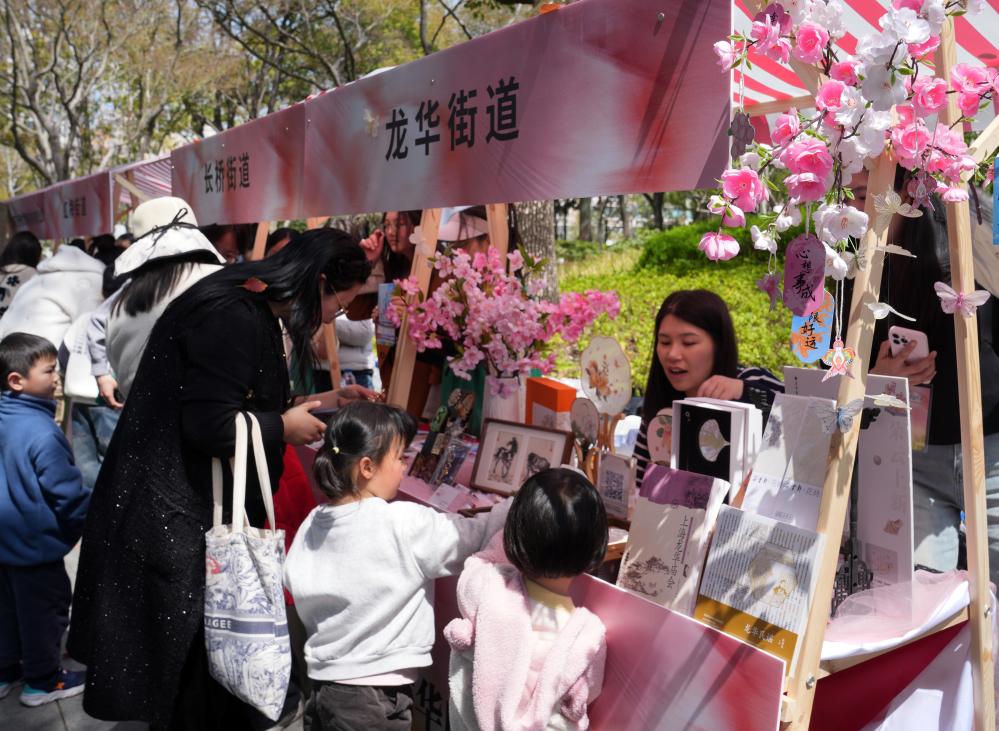 3月28日,在徐汇区的漕溪公园,市民游客在拾趣市集上选购特色文创。