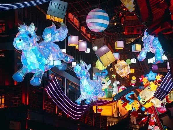 传统与创新的碰撞是本届灯会的核心亮点。豫园民俗艺术灯区不仅保留榫卯工艺、楹联文化等非遗元素,更引入数字光影互动技术:九曲桥每日上演《数字光影流光奇旅》,游客可通过手机召唤AI神兽“胐胐”智能伴游,体验数字化导航、AI拍照、VR穿越等沉浸式玩法,“数字灯谜”互动更添游园趣味。老庙黄金、毛戈平、中国银联等品牌以灯彩形态融入场景,实现文化传承与品牌创新的双赢。
