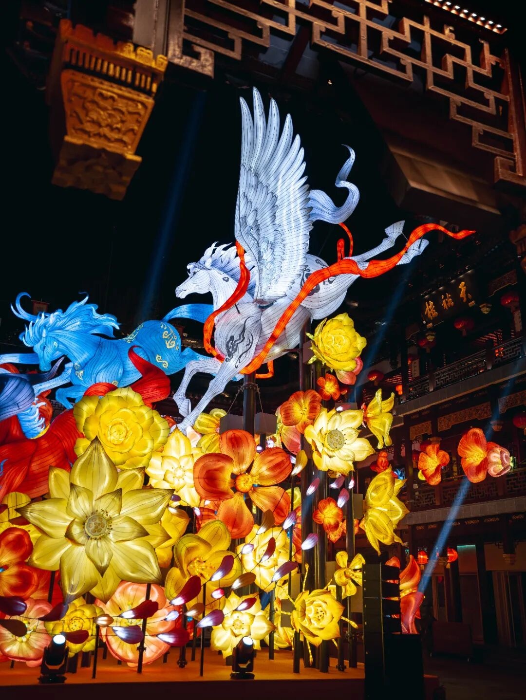 本届灯会打破传统灯会的空间局限,将灯影从豫园核心区延伸至外滩沿岸,形成覆盖多场景的全域赏灯格局。豫园民俗艺术灯区作为核心板块,推出《山海奇豫记》第四季《旷野篇》,以“以梦为马,旷野生花”为主题,通过非遗技艺与数智光影的深度融合,呈现传统文化与现代科技的时空对话。
