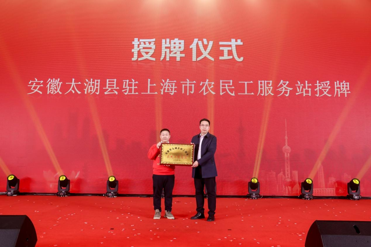 县委常委陈杰为 “安徽太湖县驻上海市农民工服务站” 授牌,潘常桂任站长,章娟任副站长