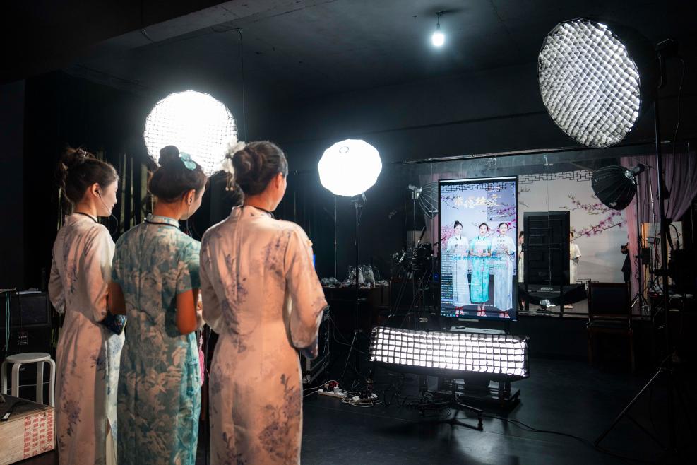 陕西省歌舞剧院的舞蹈演员在直播间进行“团播”表演(2026年1月15日摄)。
