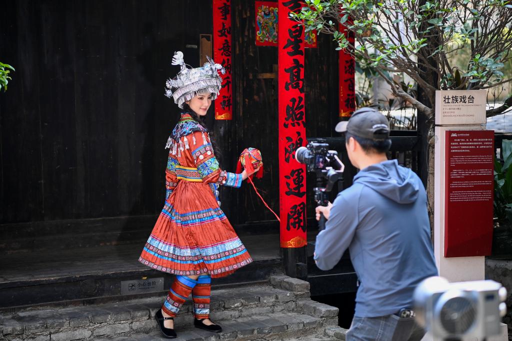2025年3月23日,在广西南宁市一处少数民族特色建筑展示区内,身穿民族服饰的游客(左)拿着绣球拍摄旅游短视频。