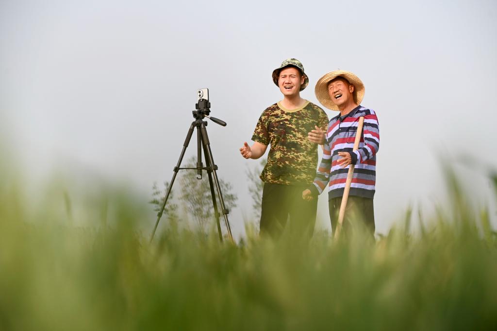 2025年4月20日,康建庄(右)和康开放父子俩在田野上直播唱歌。在河南省沁阳市王召乡北龙盘村,有一对爱唱歌的“快乐父子俩”。凭借着淳朴的嗓音、充满浓郁乡间风味的歌曲和满满正能量的歌词,父子俩唱成了拥有数百万粉丝的网络红人。