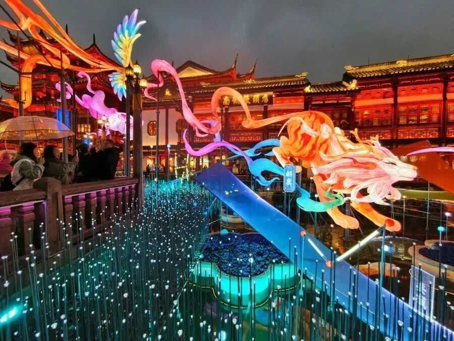 传统与创新的碰撞是本届灯会的核心亮点。豫园民俗艺术灯区不仅保留榫卯工艺、楹联文化等非遗元素,更引入数字光影互动技术:九曲桥每日上演《数字光影流光奇旅》,游客可通过手机召唤AI神兽“胐胐”智能伴游,体验数字化导航、AI拍照、VR穿越等沉浸式玩法,“数字灯谜”互动更添游园趣味。老庙黄金、毛戈平、中国银联等品牌以灯彩形态融入场景,实现文化传承与品牌创新的双赢。