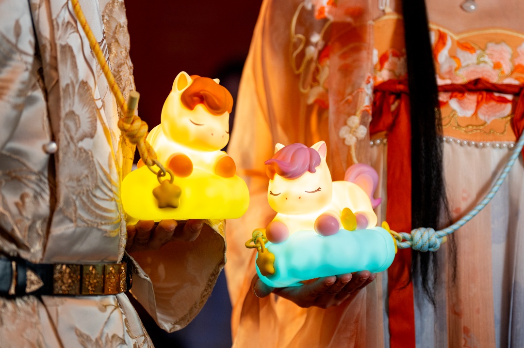 黄金广场的三层巨型走马灯以传统榫卯工艺为骨、数字光影为魂,六面年俗画卷循环流转;中心广场“骏驰九州,步步生花”主灯组取材“盛唐六骏”,融入洛阳博物馆馆藏元素,灯光亮起时马蹄生花,尽显马年祥瑞;九曲桥区域化身“马跃星河”幻境,二十八星宿与《山海经》神兽灯组交相辉映,帝江、吉量、飞廉等瑞兽在星海间驰骋,构筑起宏大奇幻的光影长卷。