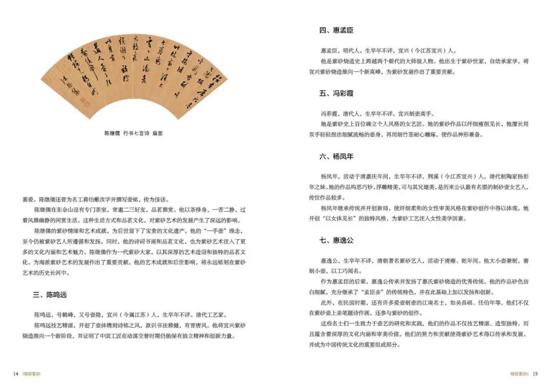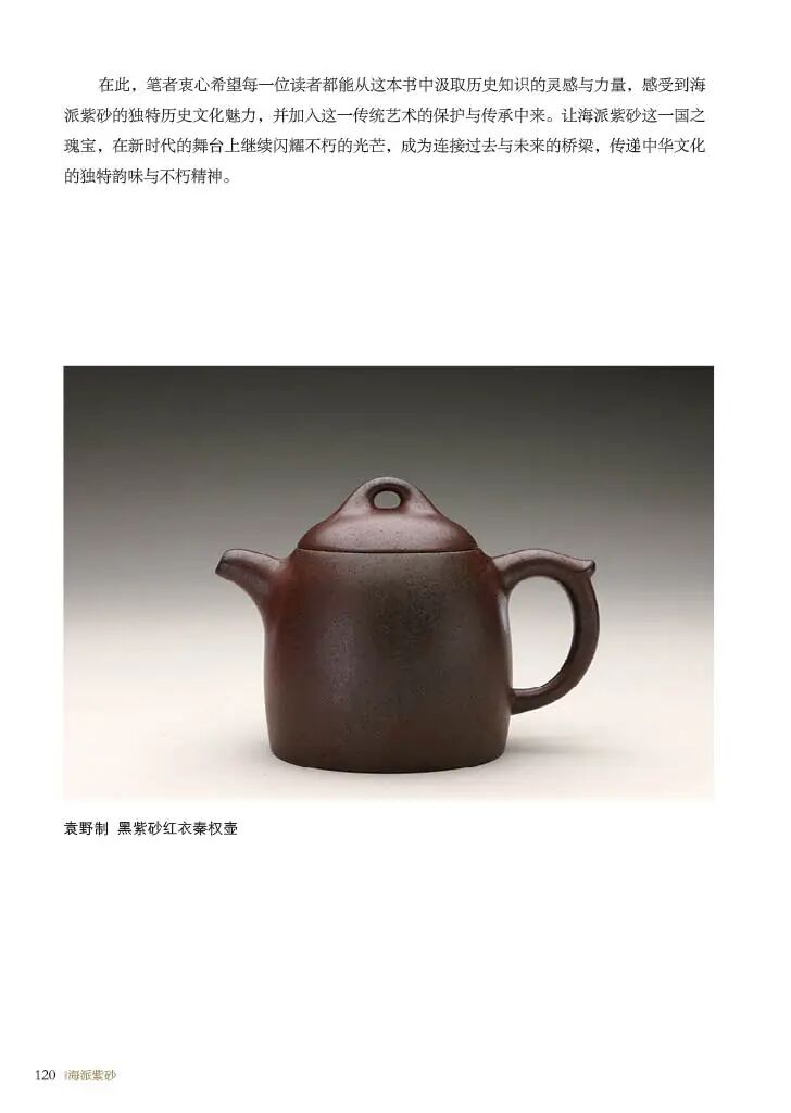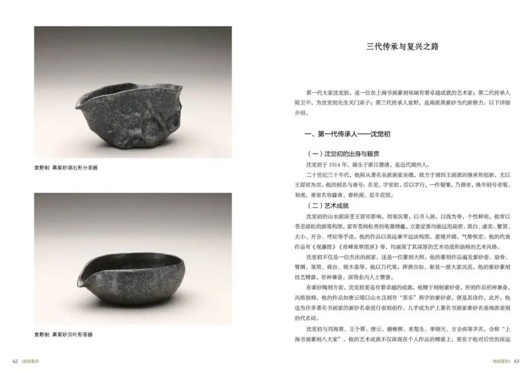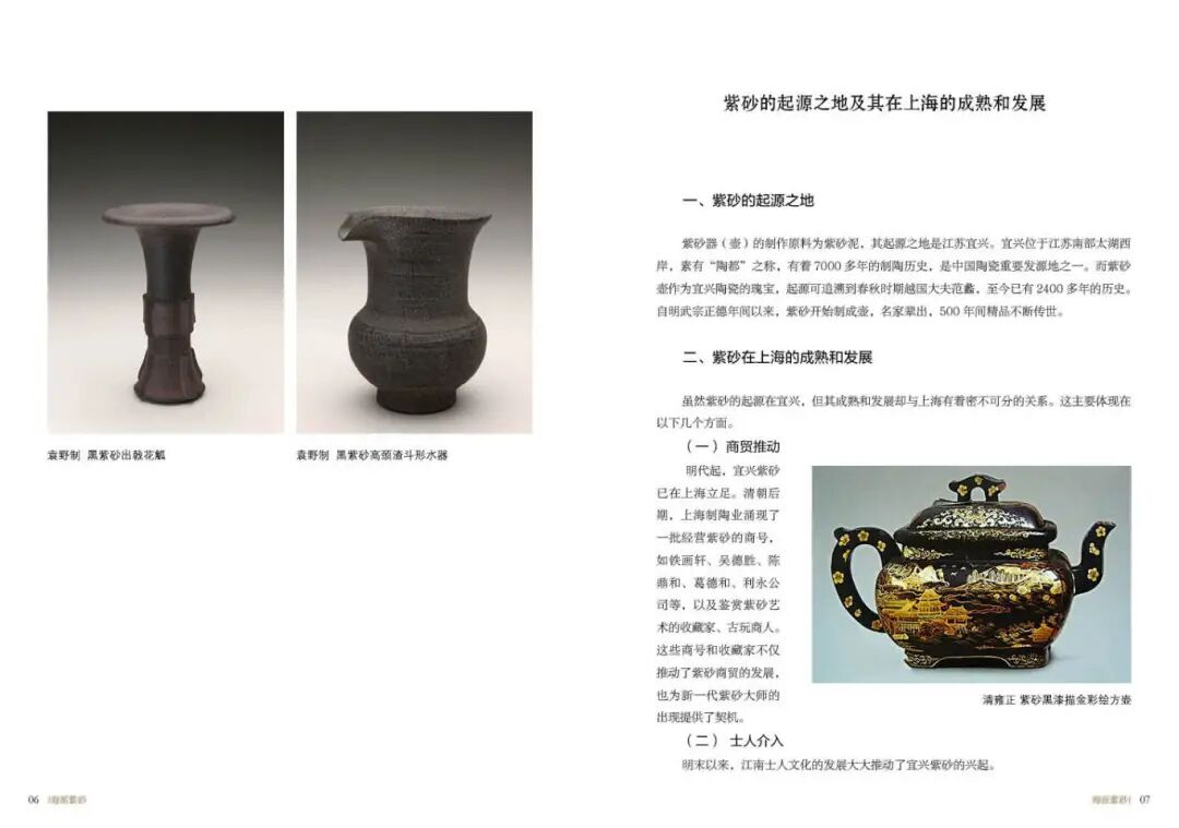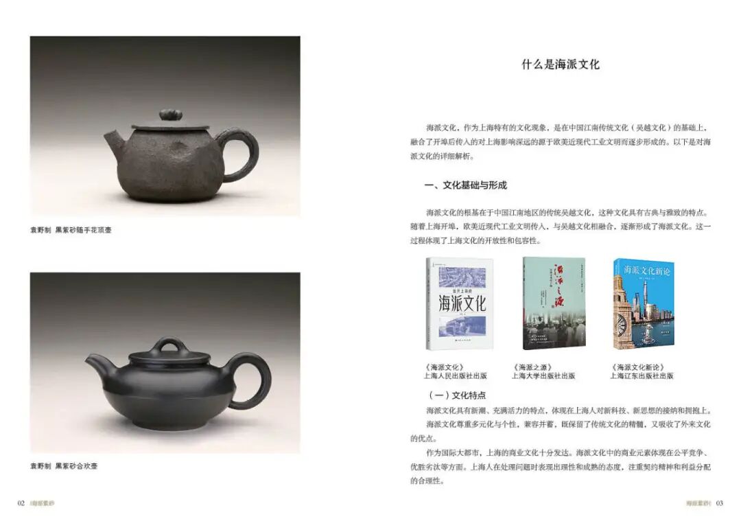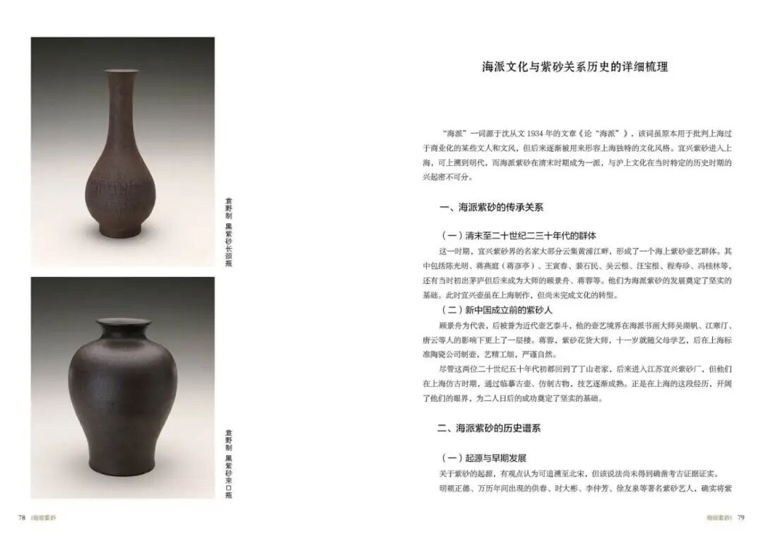 《海派紫砂》一书系统地梳理了海派紫砂的起源、发展、兴盛及传承历程,详细记录了从明代宜兴紫砂在上海立足,到清末民国时期海派紫砂成为一派,再到现代海派紫砂的创新与发展的全过程。这一研究填补了上海工艺美术史中关于海派紫砂研究的理论的空白,为学者和研究者提供了宝贵的历史资料和参考依据。