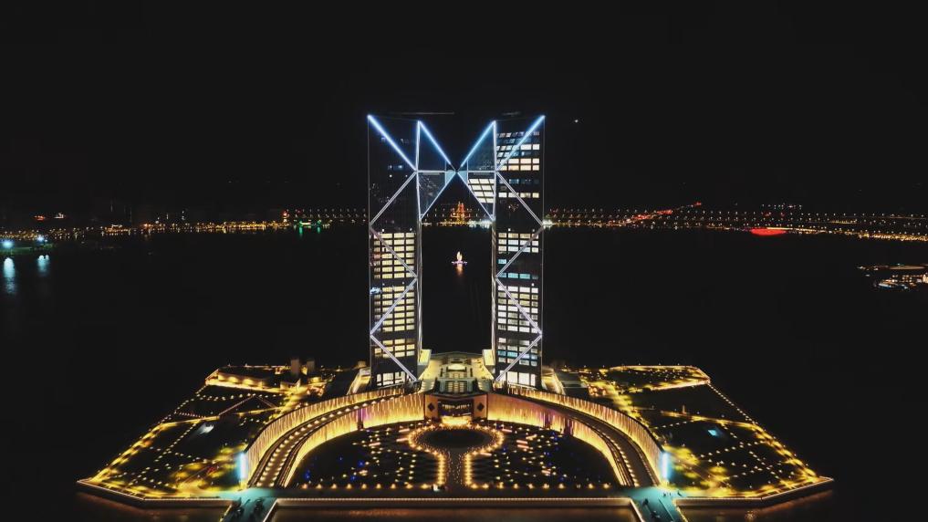 作为当前临港新片区最高标志性建筑,该项目位于滴水湖西岛屿,总建筑面积达28.25万平方米,建筑主体由两栋高195米的双子塔楼组成。项目整体景观以滴水湖中心线为轴对称分布,强化了环湖景观的连贯性与整体性。岛内外圈的步道沿线视野开阔,游人可全方位领略滴水湖的湖光山色。